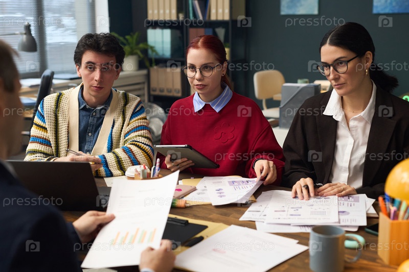 Молодой человек и две молодые женщины обсуждают бизнес-стратегию