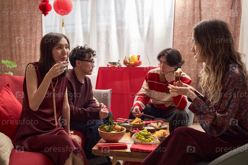 Группа молодых взрослых, которые общаются и едят традиционную пищу во время праздника