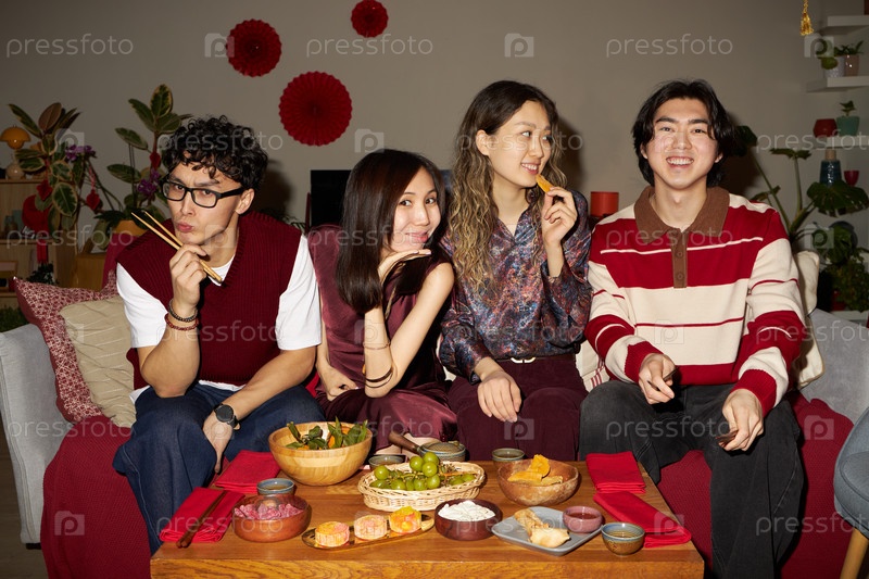Группа молодых взрослых азиатских друзей, отмечающих праздник Тет и наслаждающихся едой