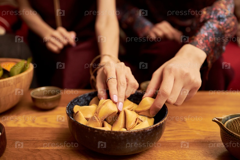 Молодые взрослые женщины и мужчины, стремящиеся получить печеньки с удачей во время праздничного собрания