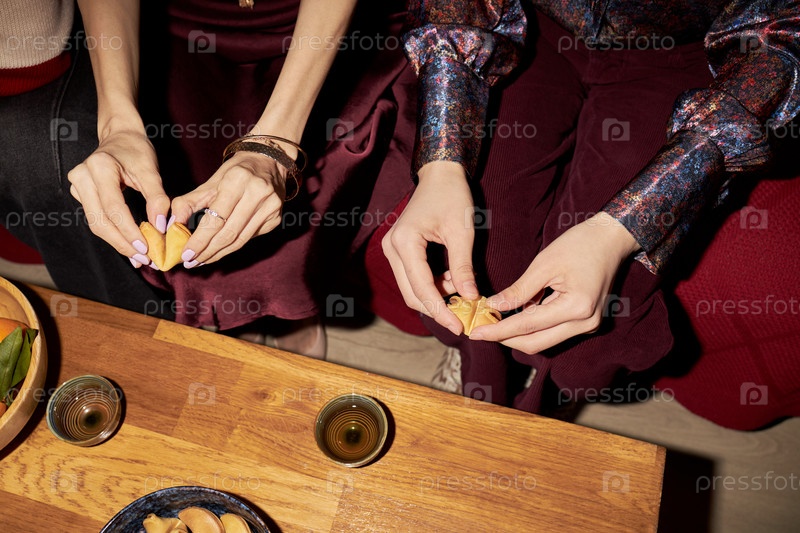 Кавказские молодые женщины делятся печеньками удачи во время праздника Тет