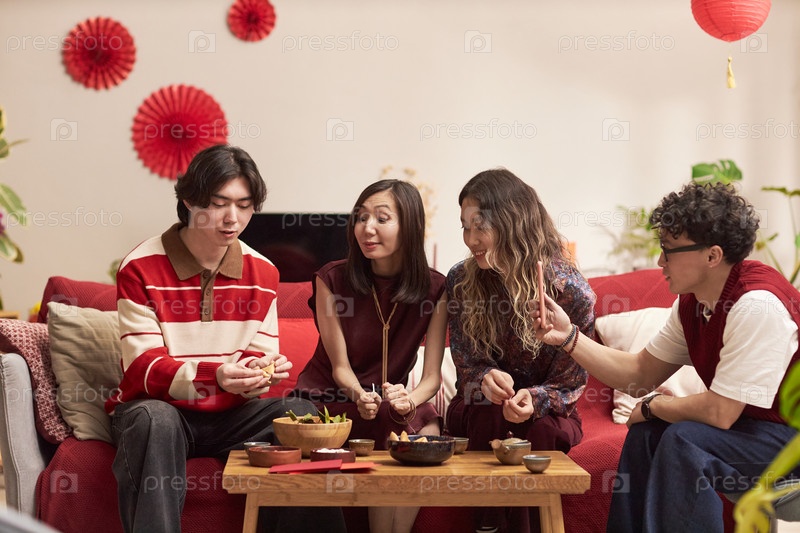 Группа молодых взрослых азиатских друзей, делящихся традиционной едой во время праздничного собрания