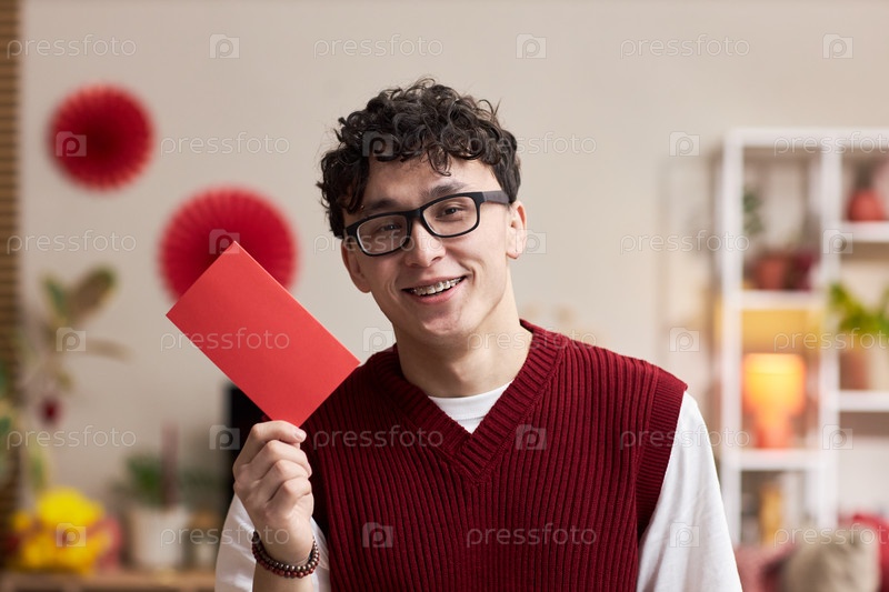 Портрет молодого взрослого белого человека, улыбающегося в то время как он держит красный конверт