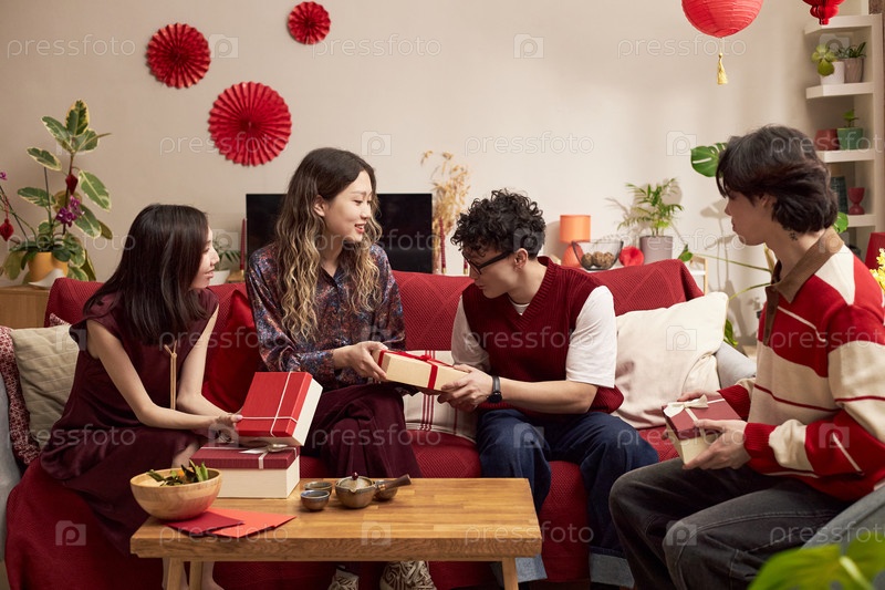 Молодые азиатские взрослые обмениваются подарками и улыбаются во время праздника Тет