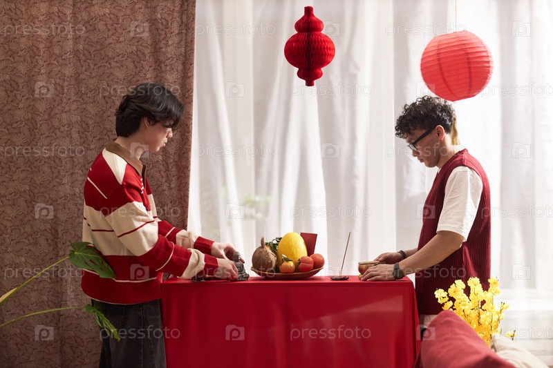 Два молодых взрослых азиатских мужчины готовят праздничные предложения во время торжества Тет