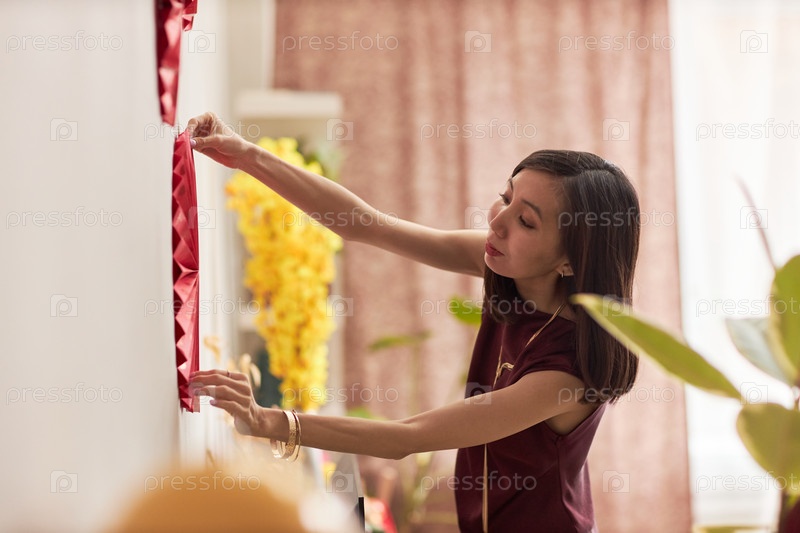 Молодая взрослая азиатская женщина украшает стену праздничными орнаментами во время каникул