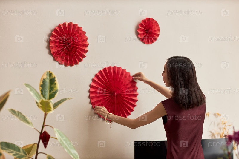 Молодая взрослая азиатская женщина украшает стену красными вентиляторами бумаги для праздничного торжества