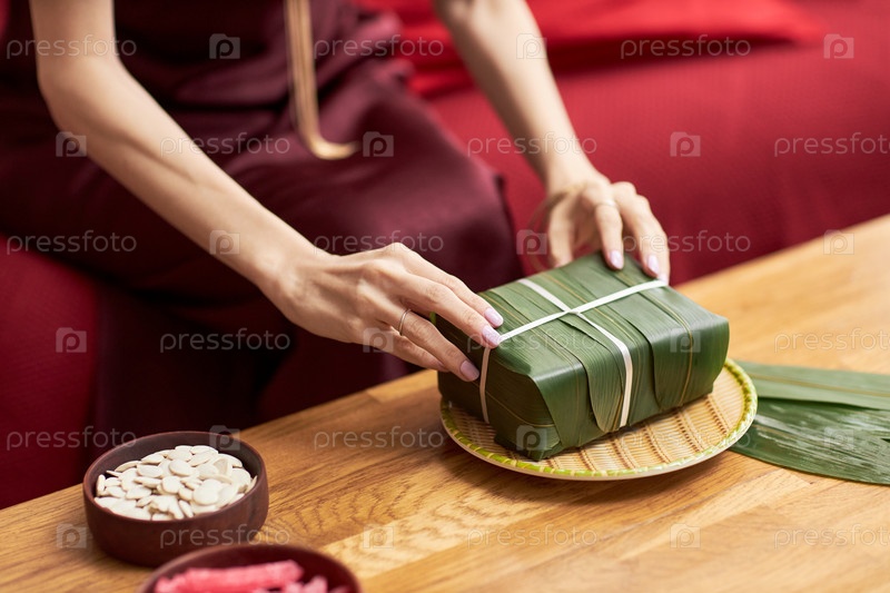 Кавказская молодая женщина упаковывает традиционный праздничный рисовый торт для торжества Тет