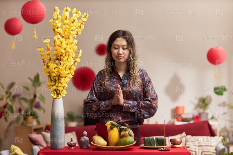 Молодая взрослая азиатская женщина молится за праздничным столом, отмечая праздник Тет