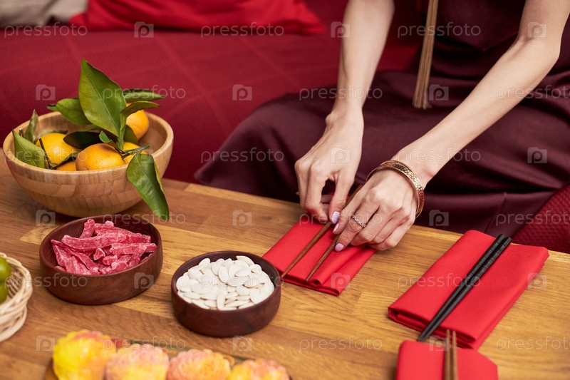 Молодая кавказская женщина устраивает палочки на столе для празднования праздника Тет