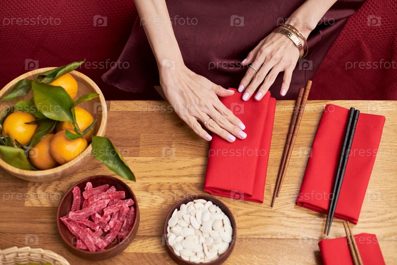 Кавказская женщина устраивает красные салфетки для праздничного торжества Тэт
