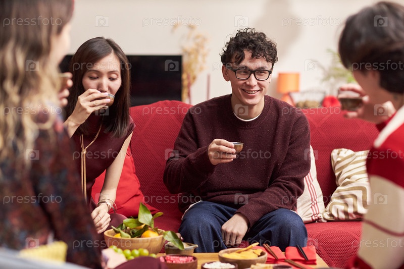 Молодые многонациональные друзья отмечают праздник Тет и наслаждаются традиционной едой