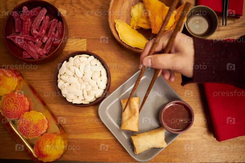 Кавказский молодой взрослый рукой подбирает весенний ролик во время праздника Тэт
