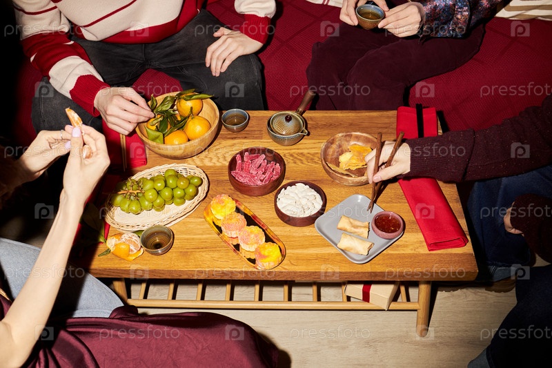 Группа молодых взрослых, наслаждающихся праздничными фруктами и сладостями во время собрания Тет