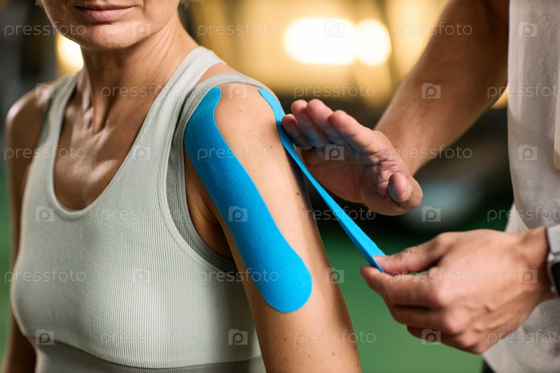 Кавказская женщина среднего возраста получает кинезиологическую запись во время реабилитации
