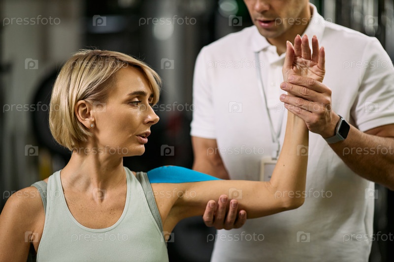 Кавказская женщина проходит реабилитацию плеча с физиотерапевтом