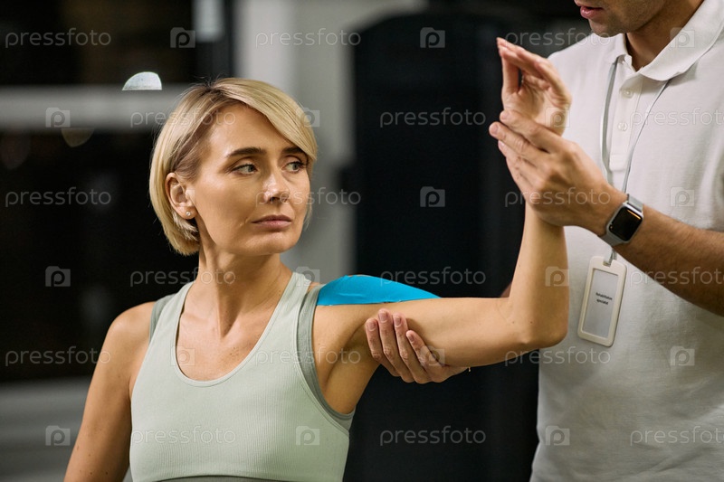Кавказская женщина средних лет, проходящая реабилитацию плеча с терапевтом