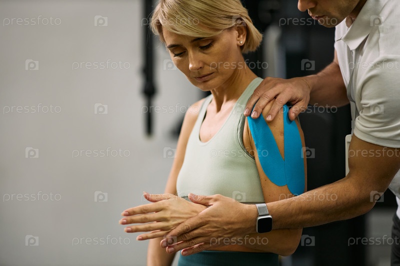 Белая женщина средних лет, получающая реабилитацию плеча с помощью терапевта