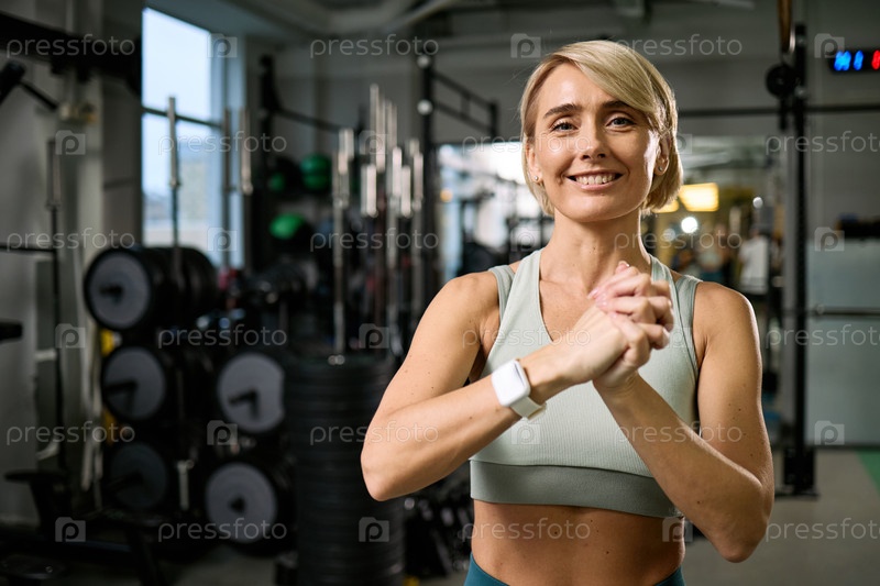 Портрет белокожей женщины среднего возраста, улыбающейся во время сеанса физиотерапии