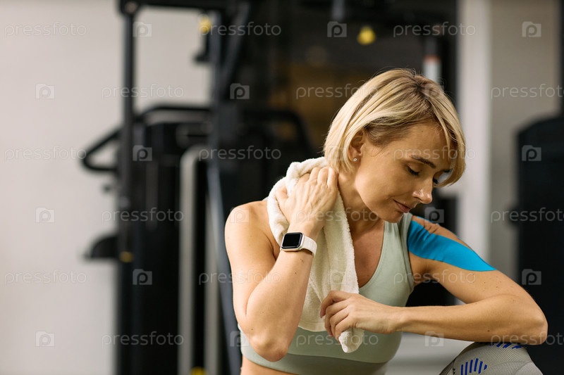 Кавказская молодая женщина восстанавливает плечо с кинезиологической лентой в спортзале