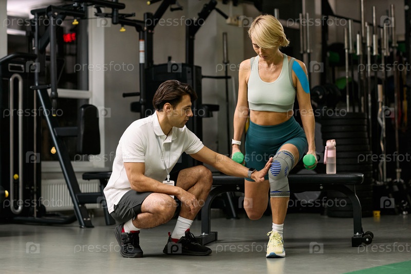 Кавказская молодая женщина выполняет реабилитационное упражнение с физиотерапевтом