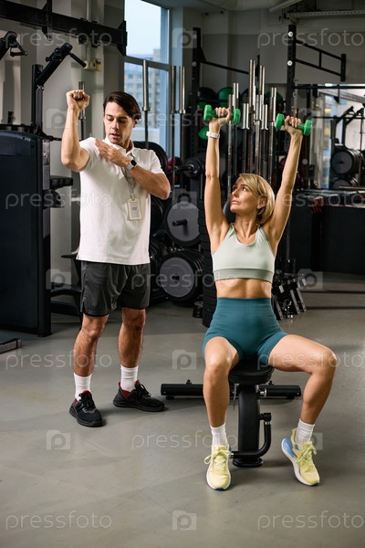 Кавказская молодая женщина выполняет упражнения на плече под наблюдением терапевта