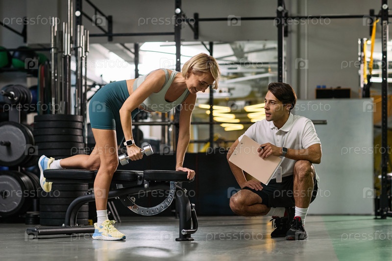 Кавказская женщина среднего возраста, выполняющая упражнения на гантеле с физиотерапевтом