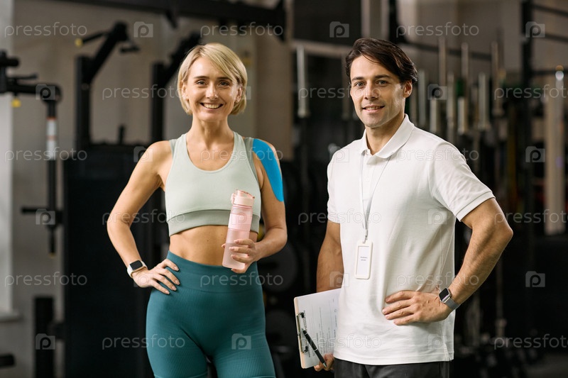 Портрет белокожей женщины и мужского физиотерапевта, стоящих в тренажерном зале с улыбкой