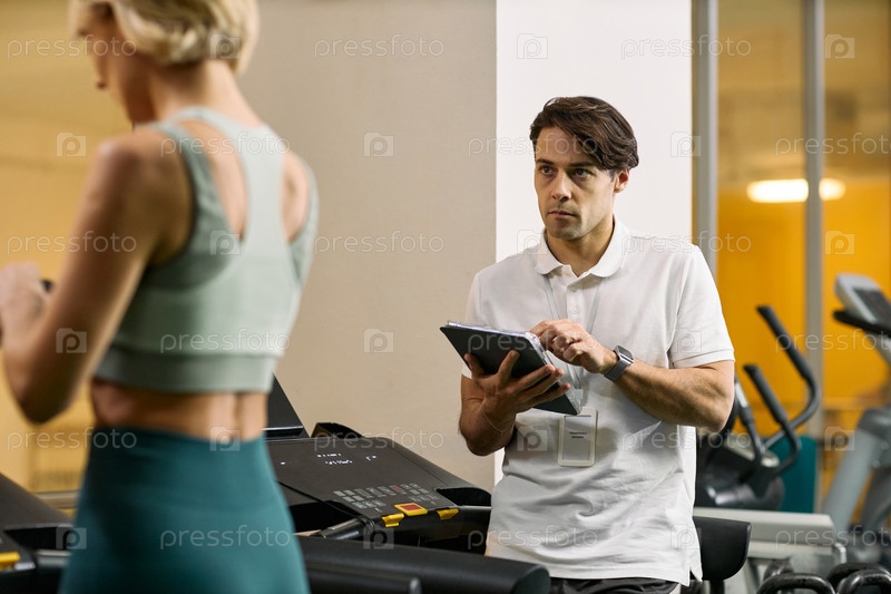 Кавказский молодой человек отслеживает реабилитационную сессию с помощью планшетного устройства