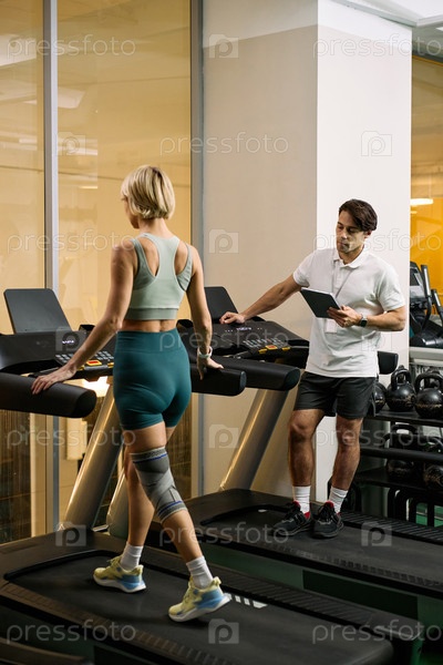 Кавказская молодая женщина ходит на беговой дорожке под наблюдением терапевта