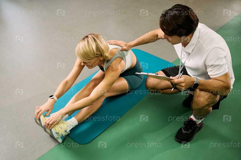 Кавказская женщина средних лет растягивается с помощью мужского физиотерапевта
