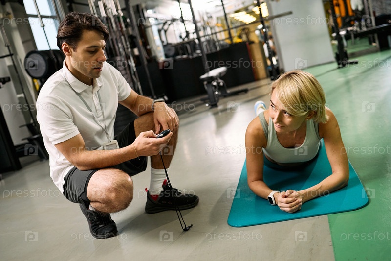 Кавказская молодая женщина, выполняющая упражнения на планке с мужским физиотерапевтом под наблюдением