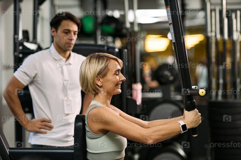 Кавказская молодая женщина выполняет реабилитационное упражнение под наблюдением терапевта