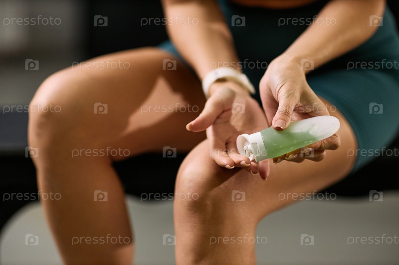 Молодая взрослая кавказская женщина наносит местный гель во время физической реабилитации