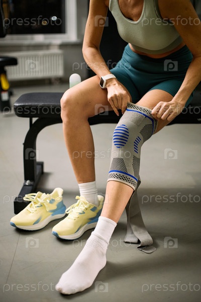 Женщина, надевающая ортопедическую поддержку колена во время реабилитации