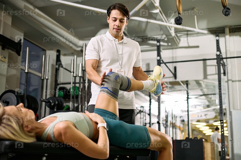 Кавказская молодая взрослая женщина, получающая физиотерапию от мужского терапевта