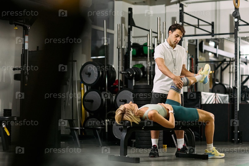 Кавказская молодая взрослая женщина получает реабилитацию ног от мужского терапевта