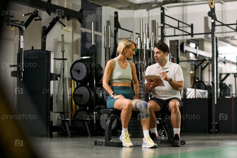 Кавказская молодая женщина консультирует мужского терапевта во время сеанса физической реабилитации