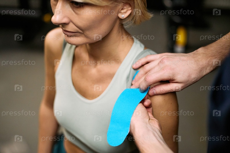 Женщина среднего возраста, получающая приложение кинезиологической ленты во время реабилитации