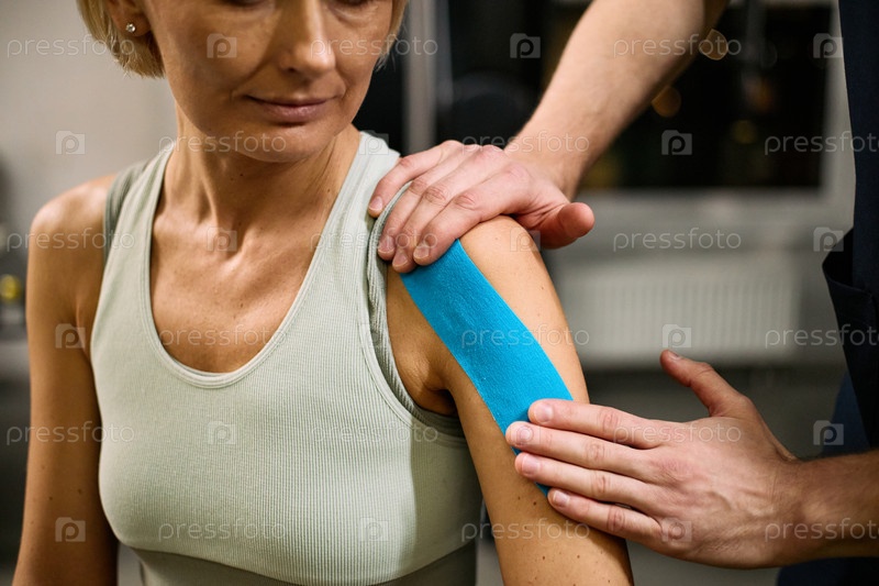 Кавказская женщина среднего возраста, получающая плечевую кинезиологию с помощью терапии