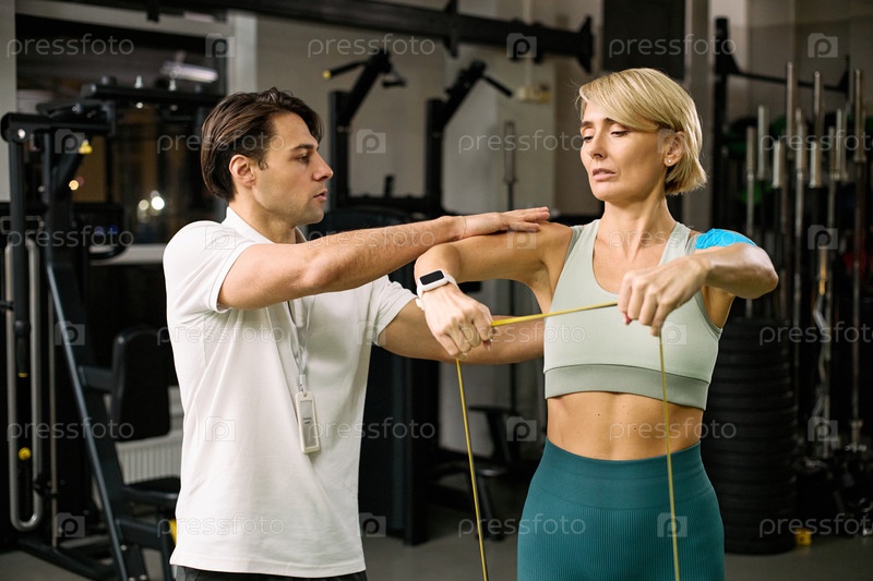 Кавказская молодая взрослая женщина выполняет упражнение группы сопротивления с терапевтом
