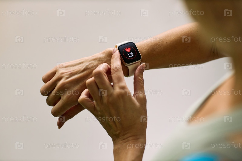 Женщина, отслеживающая сердечный ритм с помощью умных часов во время реабилитации