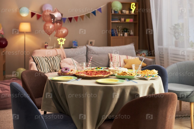 Стол с праздничной едой и декорациями ожидает гостей в уютной гостиной