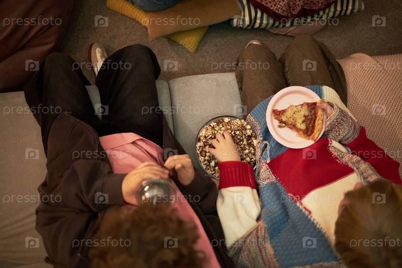 Подростки отдыхают в помещении, едят попкорн и пиццу во время свободного времени