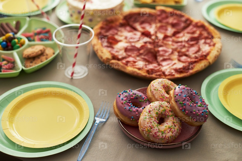 Разнообразные сладости и пицца расположены на столе во время празднования дня рождения