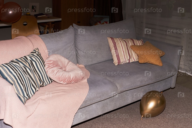 Пустой диван в гостиной с декоративными подушками и воздушным шаром на полу