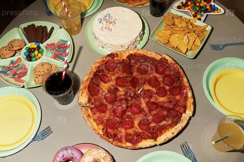 Высокий вид пиццы Pepperoni и разнообразных закусок, расположенных на столе вечеринки