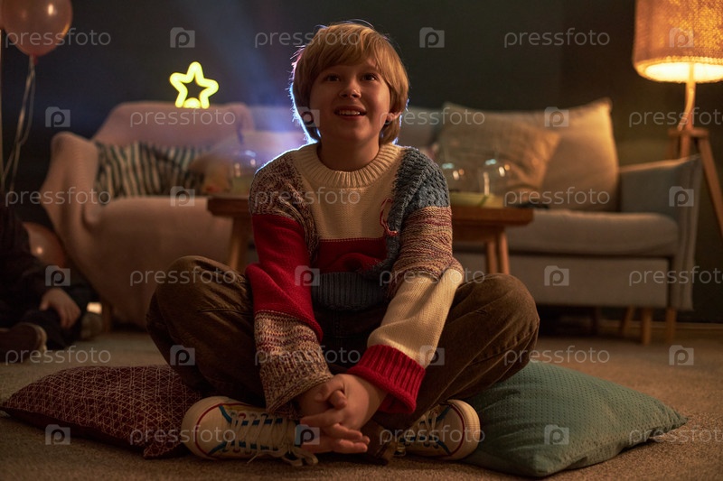 Кавказский ребенок мальчик сидит с перекрещенными ногами внутри дома улыбается и смотрит вверх