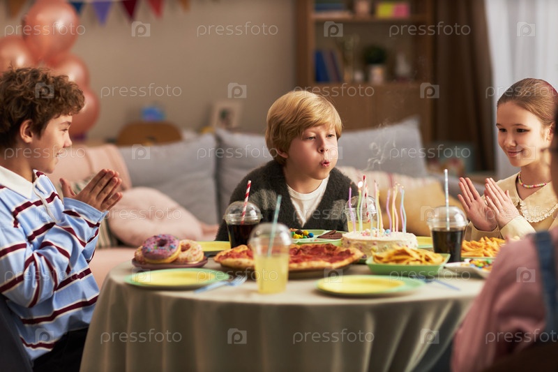 Кавказский мальчик дует в рождественские свечи, окруженный празднующими детьми