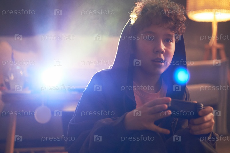 Подросток-белый мальчик играет в видеоигру с игровым контроллером внутри
